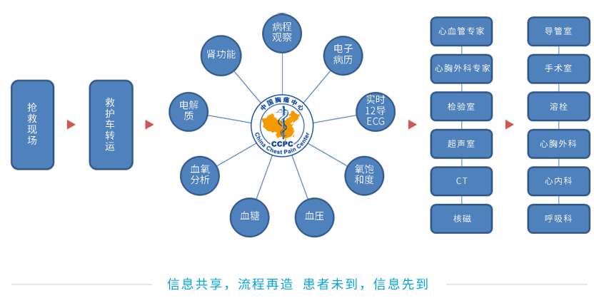 中国人民解放军总医院(301医院)胸痛中心2014年引进了扁鹊飞救®系统等信息网络技术,该技术包括了蓝牙12导联实时心电传输系统、院前急救电子病历系统、急救时间管理系统、胸痛数据分析与挖掘系统,通过3G/4G和卫星传输技术,可实时传输心电图、血氧、血压等数据,实现了胸痛中心和救护车、急诊科之间信息的实时传输,做到了患者未到、信息先到,高危患者可直接启动急救绿色通道,争取救治时间,进一步降低了死亡率,此外还可以对远程急救现场进行诊疗指导,提高了基层医院的救治技术。