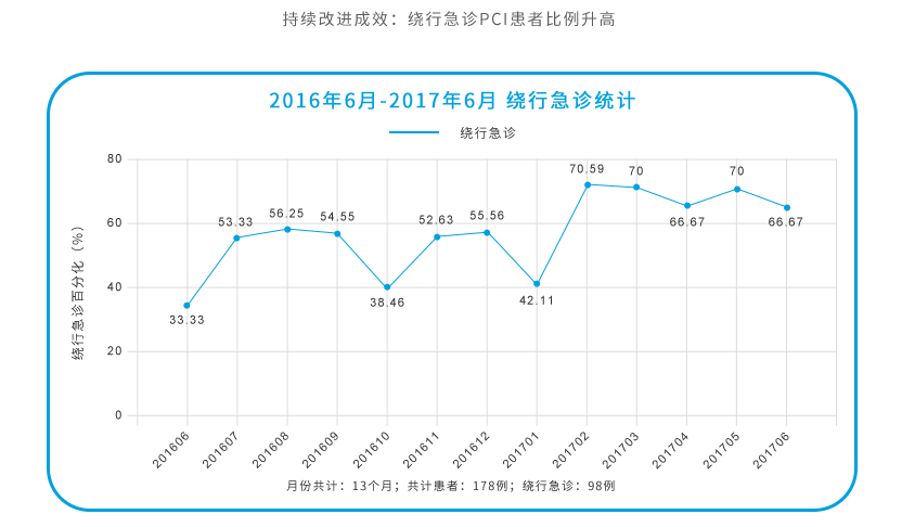 科技惠民,中心配备了扁鹊飞救®系统,不断完善远程传输系统及数据库系统,强化胸痛急救数据的采集、保存优化信息化架构和整体运作框架。中心成立以来,收治急性非创伤性胸痛患者数百例,其中急性心肌梗死患者近百例,急诊PCI数量增长迅速,占PCI总量的30%以上。